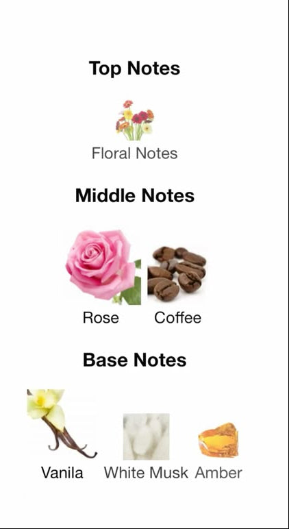 Un profumo seducente e gourmand, che unisce la calda intensità del caffè all’eleganza della rosa e alla dolcezza della vaniglia e del muschio bianco.